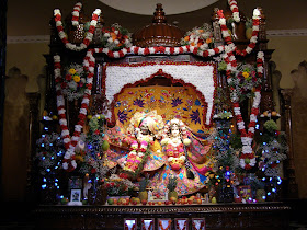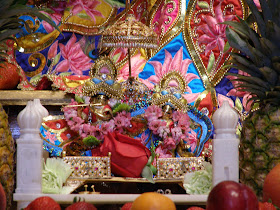 Krsna said, "Oh, Mother, you have come!" Surabhi said, "Yes. I have brought my son with me. I request that You please excuse him." Surabhi began to supply large quantities of milk. Indra, the demigods, and the great sages present then began the abhisheka (bath) of Krsna, just as we did here today. Krsna then became very happy and said, "In the future I don't want to have to tolerate your nonsense activities. For your own good you should go to Navadvipa, and there, in the company of Surabhi, perform austerities. In that way you will be excused." Indra thus understood that Krsna was the Supreme Personality of Godhead.