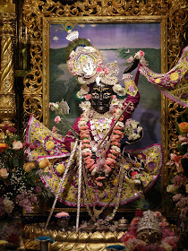 "I worship Govinda, the primeval Lord, who is adept at playing on His flute, whose eyes are like petals of a blooming lotus, whose head is bedecked with a peacock's feather, whose figure of beauty is tinged with the hue of blue clouds, and whose unique loveliness charms millions of Cupids." [Brahma-samhita 5.30]
