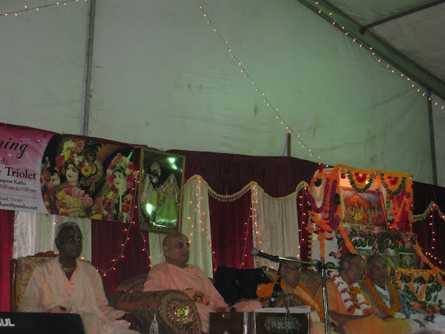H.H. B.B. Govinda Maharaj leads kirtan on stage in the pandal.