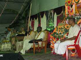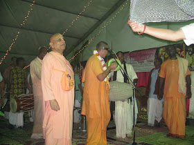 H.H. B.B. Govinda Maharaj leads kirtan on stage in the pandal.