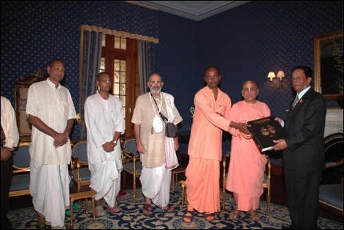 Basu GhoshInauguration festival Mauritius The President of the Republic of Mauritius, His Excellency The Honorable Sri Anerood Jugnauth (Anirudh Jagannath) with H.H. Nava Yogendra Swami, Sriman Raghava Pandit Das, Basu Ghosh Das, and Mukta Purush Das @ the Presidential residence, Mauritius