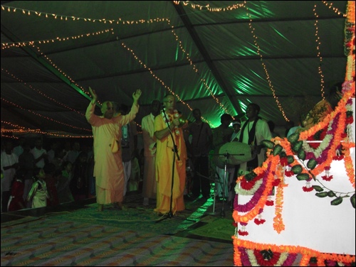 H.H. Bhakti Chaitanya Swami, H.H. Nava Yogendra Swami, Isvara Das, Basu Ghosh Das and Mukta Purush Das during the "Mahakumbha procession" during the inaugural ceremonies of the Sri Sri Rukmini Dwarakadish Mandir, Triolet, Mauritius