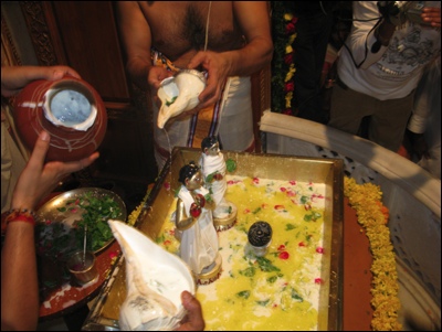Darshan arati (Deities new dresses), midnight abhishek (bathing the Deities at midnight, the time of Lord Krishna's birth), huge crowds in the temple, scenes from the temple area, road scene at night.
