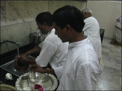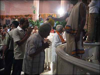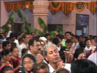 Darshan arati (Deities new dresses), midnight abhishek (bathing the Deities at midnight, the time of Lord Krishna's birth), huge crowds in the temple, scenes from the temple area, road scene at night.