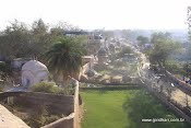 No mesmo local, de cima, vemos o samadhi de Sanatana Goswami (na esquerda da foto). Onde hoje está a estrada, corria o Rio Yamuna. O rio mudou seu curso no século 19.