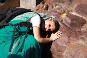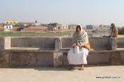 Como Govardhana é considerado não diferente de Krishna, para os devotos é ofensivo andar em cima do morro. Então existem lugares especiais onde facilita-se o acesso ao morro para que possamos oferecer nossas reverências diretamente a Govardhana. Aqui minha esposa aproveita um de tais lugares.