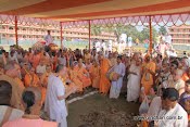 Aqui uma foto da cerimônia de invocação de benções. Nas 4 direções e no centro foram colocadas placas de metal, cada uma com um símbolo sagrado, como pede as determinações da tradição arquitetônica dos Vedas, vastu-shastra (o feng-shui védico). Todos os GBCs participaram, como também o principal patrocinador, Ambarisha Prabhu. No fundo podemos ver alguns dos prédios do complexo de Mayapur.