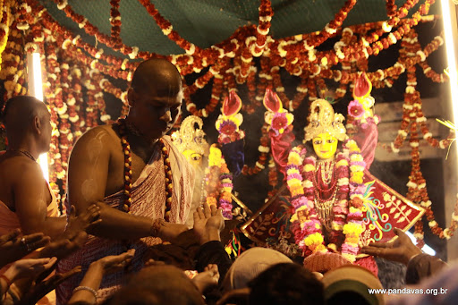 Em Mayapur temos Deidades maravilhosas, muito impressionantes. Primeiro o espetacular Pancha-Tattva, com 2,10m de altura, feito com uma combinação de oito metais, incluindo prata, ouro e platina. (Em breve Brasília terá em seu Espaço Hare Krishna uma réplica dessas Deidades!). Depois é Radha-Madhava, com as oito gopis ao lado. E, por último, o impressionante e majestoso Ugra-Nrsimhadeva com Prahlada Maharaja.