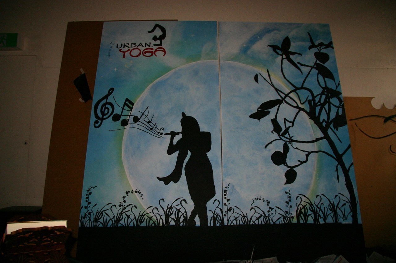 With the help of her enthusiastic crew, the 3rd floor of the famous Crossways building in taking on a new decor. The number of attendees for the Krishna Fest programs especially is sky rocketing. The walls of the Urban Yoga level will soon be featuring a mural with the Urban Yoga logo designed by Sammohini's sister. Tanya who is a professional in big buildings' mural is in charge of the painting and she has become a regular of the Wednesday's and Saturday's Krishna Fest; she is being expertly assisted by Bhaktin Annie.
