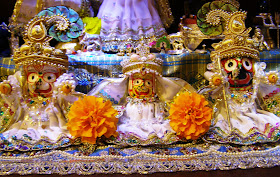 In Vrndavana, to commemorate this pastime, on the Sukla-paksa Trayodasi, all the major temples dress Radharani as Subala. Due to Her wearing a cowherd boy's dhoti, Radharani's feet are visible at that time (radha-pada-darsana). During all other times of the year the feet of Srimati Radharani are not visible to the devotees. One can thus imagine what intensity arises in the devotees when the day of radha-pada-darsana arrives - very, very intense indeed.
